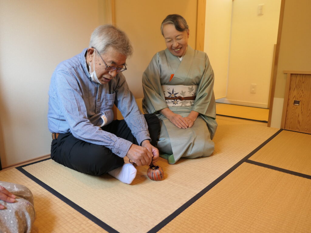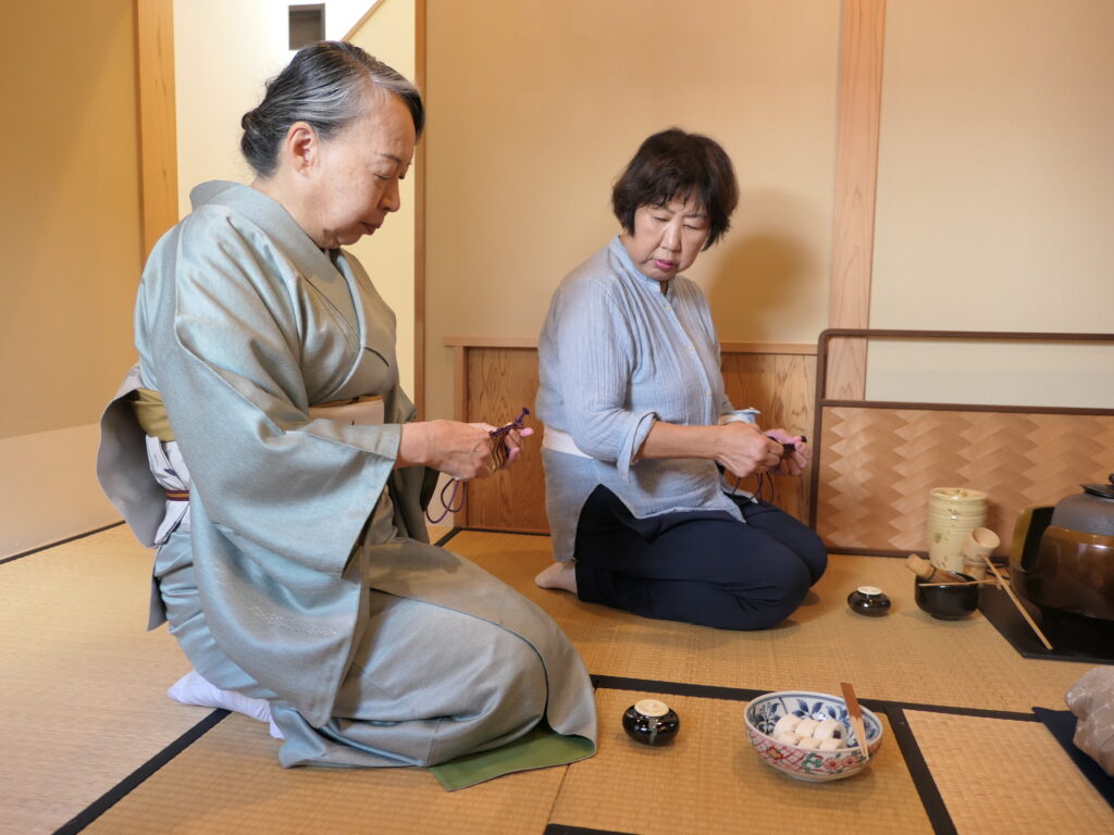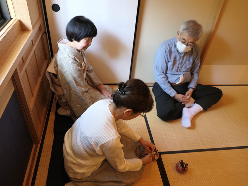 先月から稽古を始めた内海は仕覆の長緒の扱いが難しく、特にその結び方と解き方の練習に、皆さんガヤガヤと長い時間をかけていました。