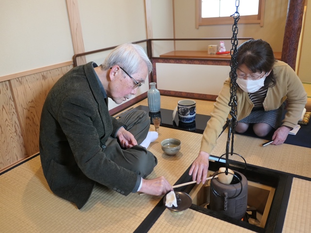 2月は年間を通して最も寒い時期ですから、客に少しでも暖かさを感じてもらう工夫を凝らしたお点前が二つあります。一つは大炉(だいろ:一辺1尺6寸)と呼ぶ大きめの炉で六畳間に切られ、「逆勝手」のお点前となります。もう一つも季節感のあるお点前で、筒状の深い茶碗を温めて出す「筒茶碗」のお手前です。