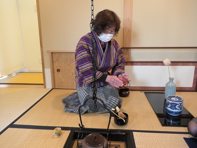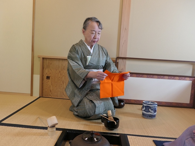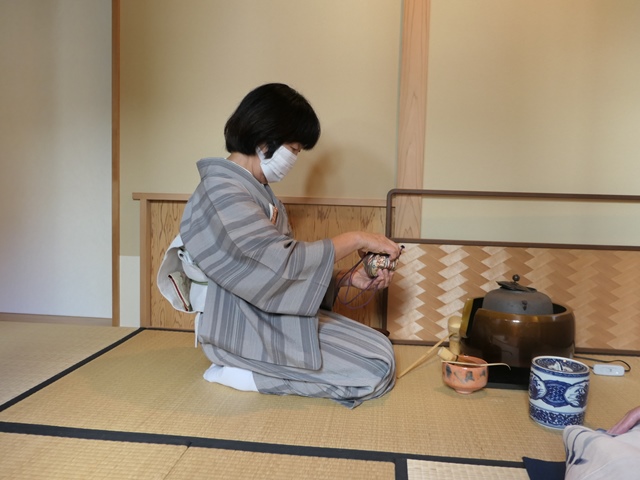 最後に大友さんがお点前をしてくれました。「続き薄」は本来は棚を用い、茶事などで後炭を省いて濃茶に引き続き薄茶をいただくお点前です。