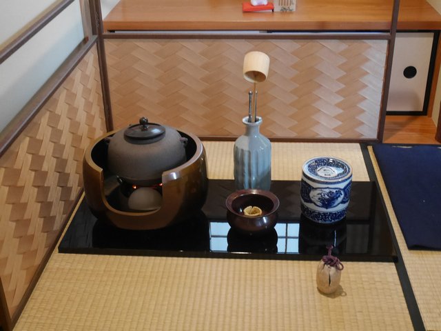 例年10月は窯の置き位置を工夫したこの月だけの中置(なかおき)点前です。半年間親しんだ風炉の茶を惜しみ、わずかに釜を客に近づけて温かみを感じてもらう趣向です。