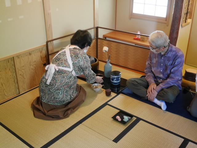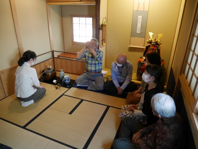 ずいぶん暖かくなりました。この5月から炉は風炉に変わります。支部役員の松島さんが、カメラを担いで撮影と応援に来てくれました。もちろん、主菓子と干菓子を準備し、濃茶と薄茶も経験していただきました。