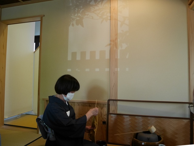 2服目を点てるときは、茶巾をしぼってたたみ直し、「チリ打ち」(ポンと音を出す)帛紗の所作をします。また、茶碗をゆすぐ「小ゆすぎ」(茶碗の湯を回して捨てる)も行います。 道具も所作も拝見も多く・・・ハイレベルのお手前でした。