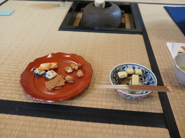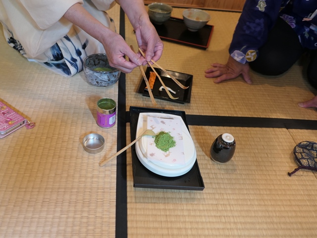 今回は濃茶の菓子器は縁高(ふちだか)を使用しました。黒文字の扱い、菓子のいただき方や菓子器を返すときのお詰(おつめ)の役割など復習しました。