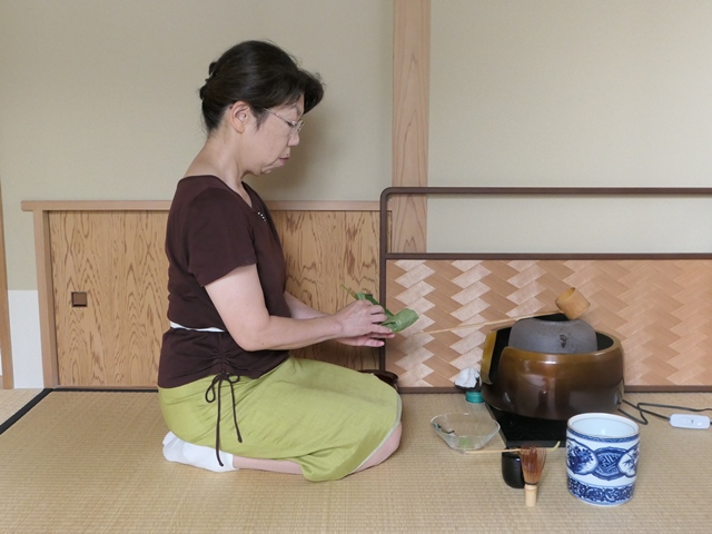 今日は梶の葉が2枚準備されていました。お点前は平点前の流れですが、水指の蓋を開けるところで 葉を手前の茎に近いところから取ります。葉脈にそってまず半分に折り、横にして葉の大きさを見ながらさらに折りたたみ茎を差して止めます。左手でポッと建水に落とします。