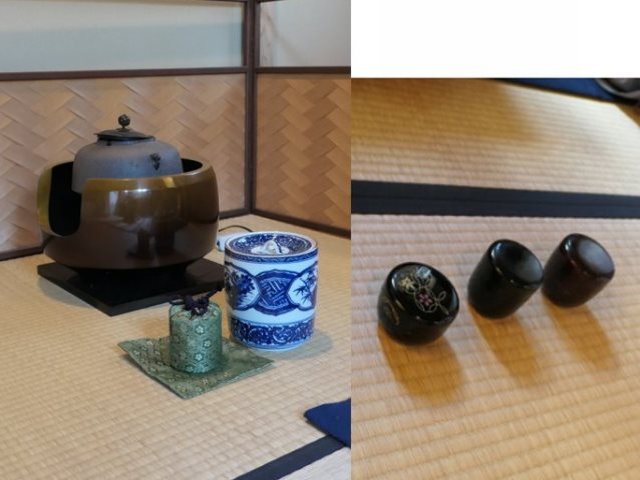通常は亭主が2種のお茶を点てますが、今回は亭主役を前半と後半と交代しましした。2種の濃茶は 1つは茶入に、もう1つは大津袋に包んだ棗に入れて、茶通箱に仕組み持ち出します。