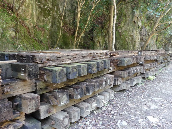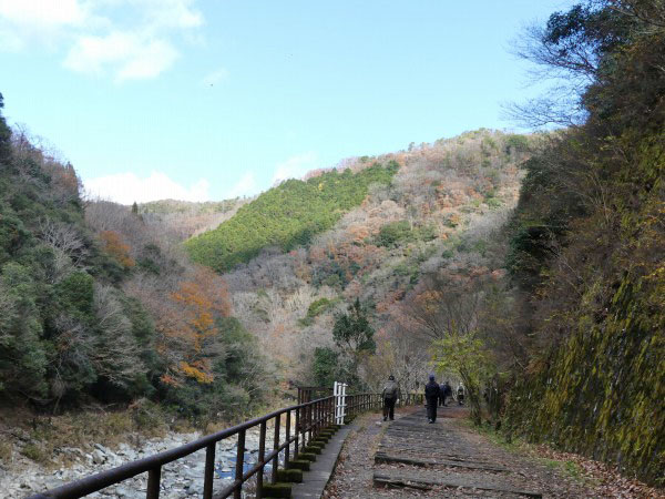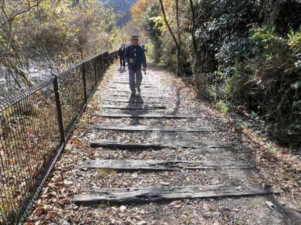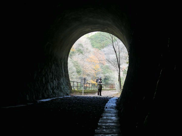 トンネルを抜けると廃線跡らしい枕木の遊歩道が表れます。紅葉も終わったとは言え落ち葉のせいか、枕木道もなかなか風情が感じられます。周囲の景色を楽しみながら800mほど歩くとコース最長の北山第二トンネル(413m)が見えてきました。 ここは枕木、枕木の釘、バラス等の足元が悪いので一層の注意が必要です。特に枕木の釘が抜かずにそのままに放置されています。