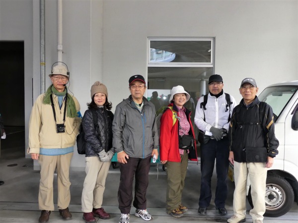駅前ロータリー横で定刻通り朝会が始まります。多数回表彰(150回の林さん)、新参加者の紹介(5名が初参加)、本日のコース説明と注意事項の徹底です。 トンネル内は無灯(真っ暗です)のため懐中電灯で足元を照らして枕木などに注意し安全を確保することが必要です。次に来年1月のコース案内です。戌年の初詣は、住吉大社です。