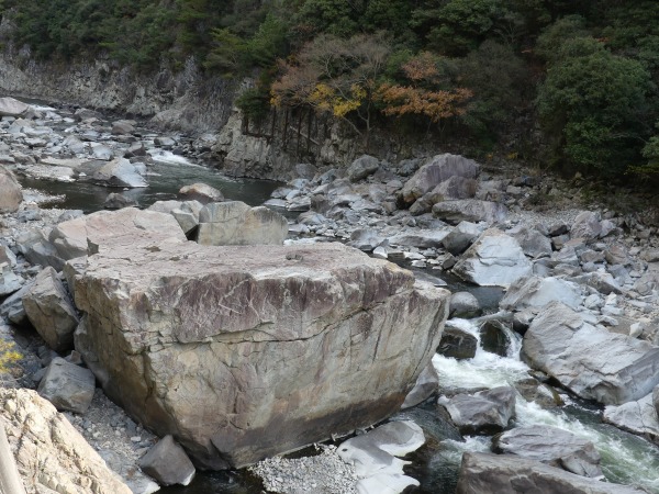 紅葉の秋らしさは影を潜め、渓谷に迫る絶壁が冬の到来を告げようとしています。更に目を引くのが渓谷のあちらこちらに林立するけた外れの大きさの巨岩群です。