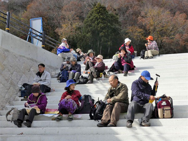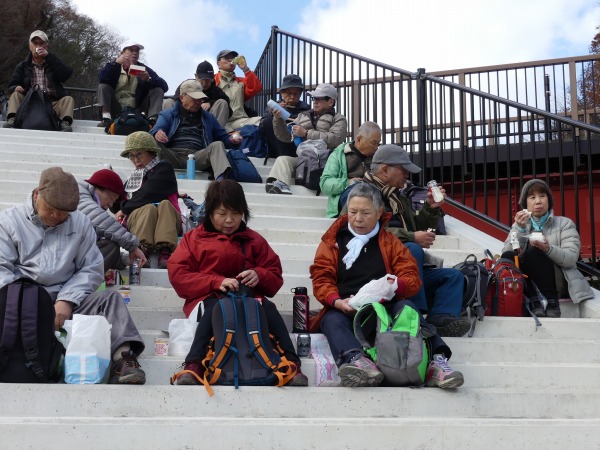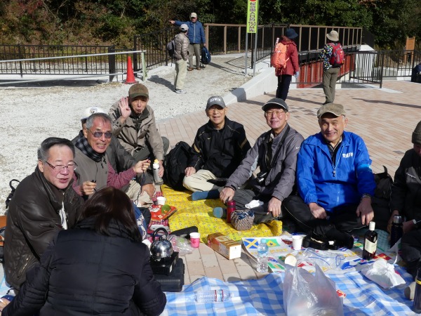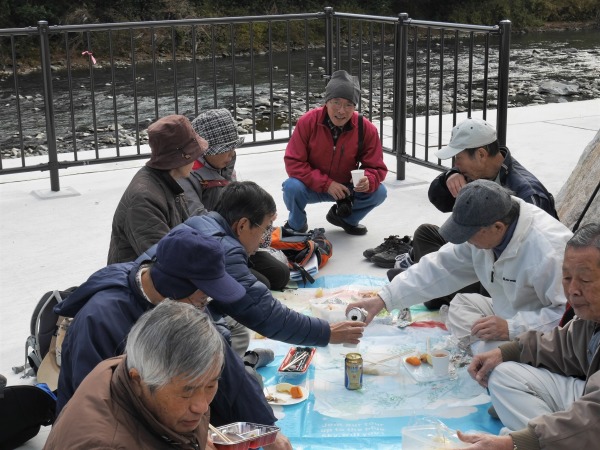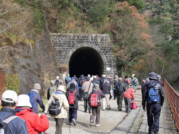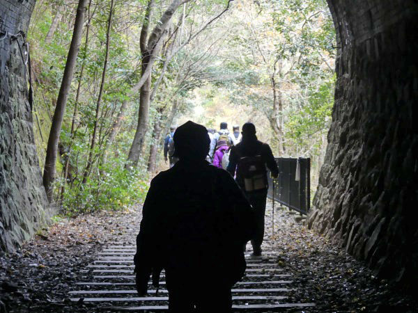 いつもよりゆっくりとした昼食を楽しむ方、風が冷たく寒かったため、早々と食事をして武田尾駅に向かう方もいます。 昼食を境に1次解散となりました。私たちも武田尾駅へ向かうことにしましょう。今日は廃線跡の枕木、枕木の釘、バラス、落石等に注意しながらの歩き慣れないコースだったのと、休憩もあまり取らなかったので武田尾駅の急階段がきつそうな参加者をチラホラ見かけます。 お疲れ様でした。気を付けてお帰り下さい。