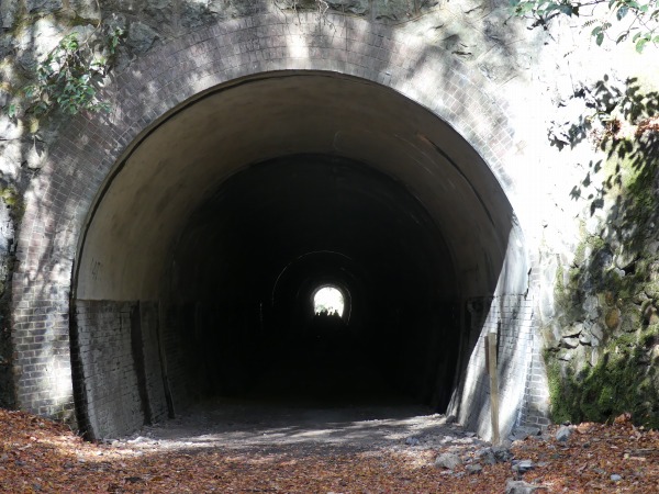 まもなく北山第一トンネル(長さ318m)が見えて来ました。トンネル内は無燈なので真っ暗である。 トンネル入口で懐中電灯の準備を行い暗闇の中へ進んでいきます。真っ暗の中を足元に注意しながら進みます。1人なら引き返すかもしれません。 理由は出口が見えていないからか。ようやく出口です。