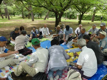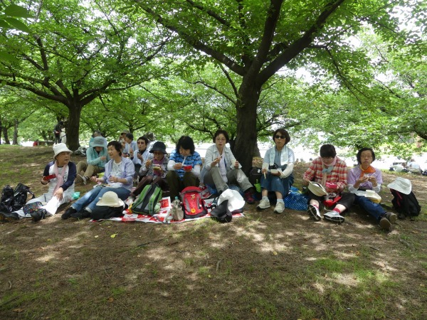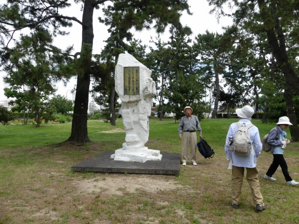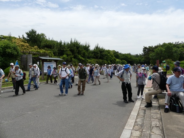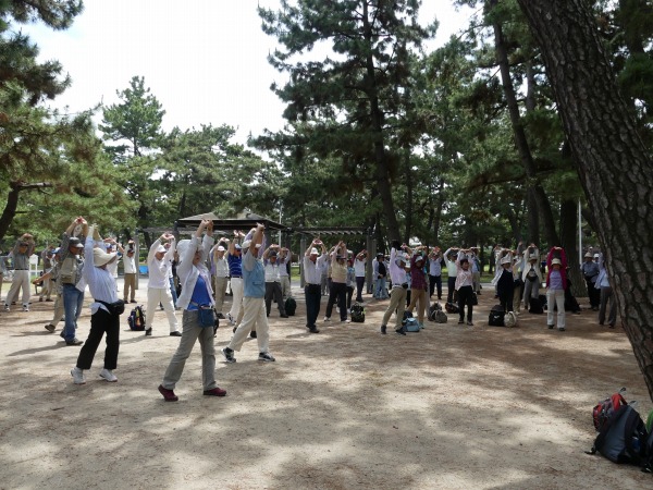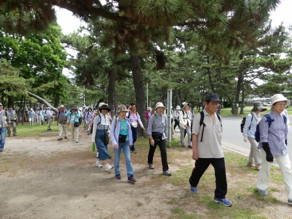 梅雨入り近しと言いながら、空は快晴、絶好なハイキング日和となった。今回の集合場所は、南海電鉄の羽衣駅からほど近い浜寺公園内の児童遊戯場付近に118名の仲間が集います。 本コースは2007年6月以来の11年振りの例会となります。明治6年に造られた日本最古の公園の一つで、「名松100選」にも選ばれている、美しい約5000本の松が繁り松林を誇ります。 白砂青松の面影を残す緑豊かな公園です。 園内にはジャイアントスライダーのあるプール、ばら庭園、交通遊園などがあり、行楽、野球やテニスなどのスポーツ、アウトドアにと総合公園として多くの人々に親しまれています。散歩やジョギングをする人も多く見かけます。