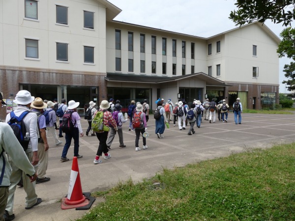 恒例の朝会では、本日のバラ園は残念ながら休園日のため外周からのバラ鑑賞になることを報告。引き続き多数回表彰、コース説明と続きます。 まずは、園内の南にある大阪国際ユースホステルに向かい、そこで少し建物内を見学します。この宿泊施設は関西国際空港に一番近いユースホステルです。 難波まで急行で20分という交通至便なロケーションながら公園内にあり静かな環境です。200名まで利用できるバーベキュー施設もあります。小休止を終えてバラ園に向かいましょう。
