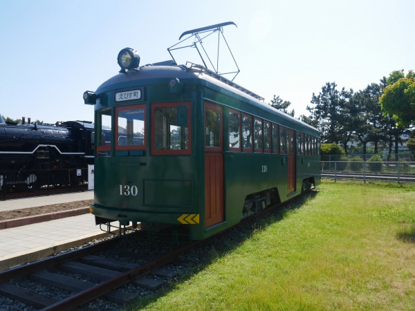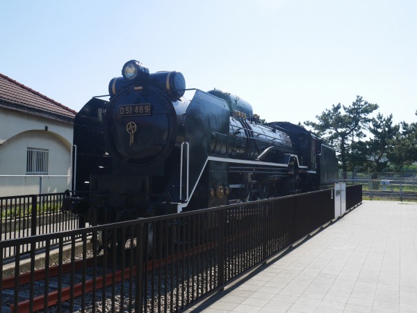 ユースホステルを出発して5分で右手に浜寺交通遊園が見えてきます。 浜寺交通遊園は、昭和45年に子どもたちが楽しみながら交通知識を身に付けることを目的として、大阪府営19公園の中で唯一開園しました。 子供汽車・ゴーカートの運行、バッテリーカー・定置式遊具の設置などもあります。映画やビデオ上映による交通指導教室も行っています。 目を引いたのは、交通遊園内に蒸気機関車D-51、阪堺電車のいわゆるチンチン電車の2輌が展示されています。水路沿いに戻り北上を続けます。