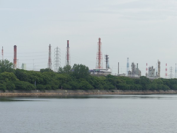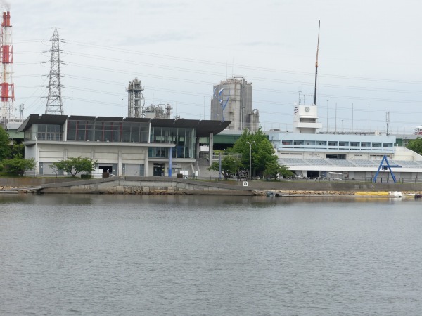 水路の対岸に府立漕艇センターが見えてきます。水路内にはチラホラとカヌーやカヤックの練習をしている方が見受けられました。 漕艇練習の先には、堺の臨界工業地帯の工場設備が林立するのが伺えます。夜間に訪れると工場群の夜景が見えるのではと想像してしまいます。 右手を見ると野球場が3つもあるのが判ります。またそれらの施設の間を縫って交通遊園の子供汽車用の線路や駅舎も確認できます。 更に北上を続けるとバラ園が見えてきました。