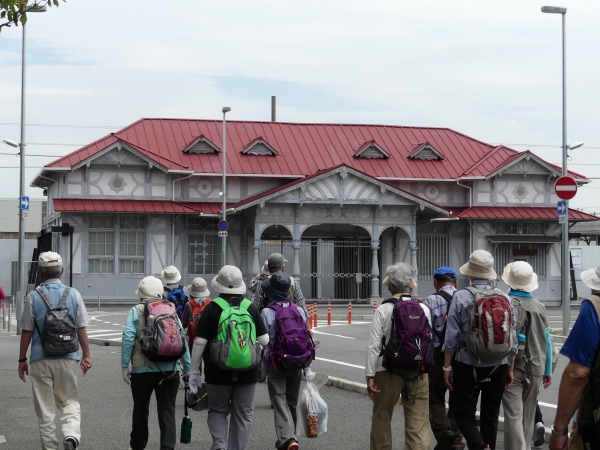 更に進むと松林が延々と続きます。その片隅に堺市生まれの歌人・与謝野晶子の歌碑「ふるさとの和泉の山をきはやかに浮けし海より朝風ぞ吹く」が目に留まります。 そのすぐ傍に「詩で浜寺の景観を守った!大久保利通が税所篤(さいしょ あつし)を動かした洒落た政治」の惜松碑が見えてきます。 浜寺公園駅は、すぐ近くです。まずは阪堺軌道の終点駅の浜寺公園駅です。昨年導入された最新型のモダンなチンチン電車で帰宅する人もいます。50メートル先に瀟洒な駅舎が見えてきます。 南海電鉄の浜寺公園駅旧舎です。南海電車の高架化工事から旧舎保存のため駅舎を移動したそうです。本日はここで解散です。お疲れ様でした。