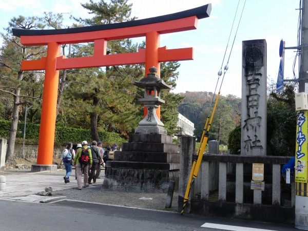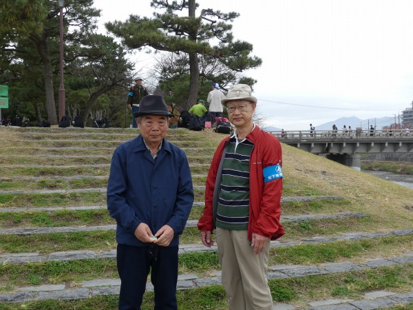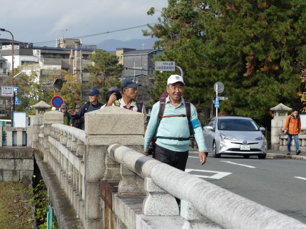 師走に入り冬本番と言いながら、空は晴、暑くなく寒くなく絶好のハイキング日和となった。今回の集合場所は、京阪電鉄の出町柳駅からほど近い下賀茂神社に隣接する鴨川公園(葵橋)付近に97名の仲間が集いました。 本コースは2012年12月以来の6年振りの例会となります。コースは出町柳駅から京大前を経て、洛東の吉田山の山頂から大文字山をまじかに見て