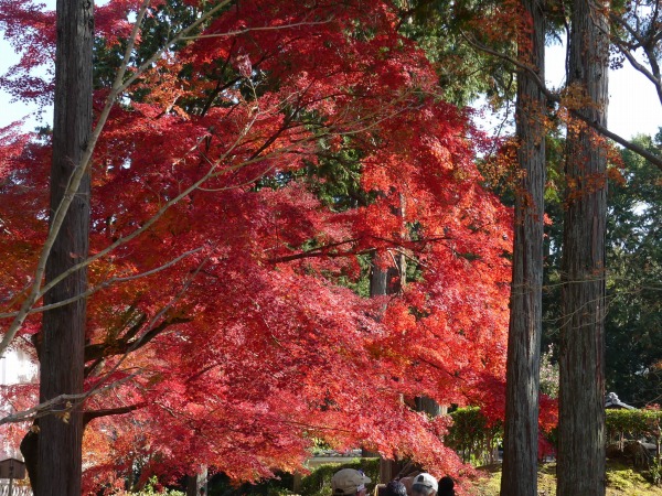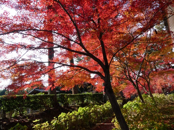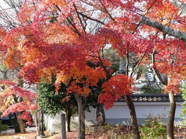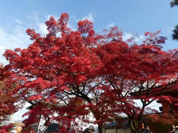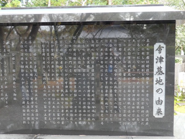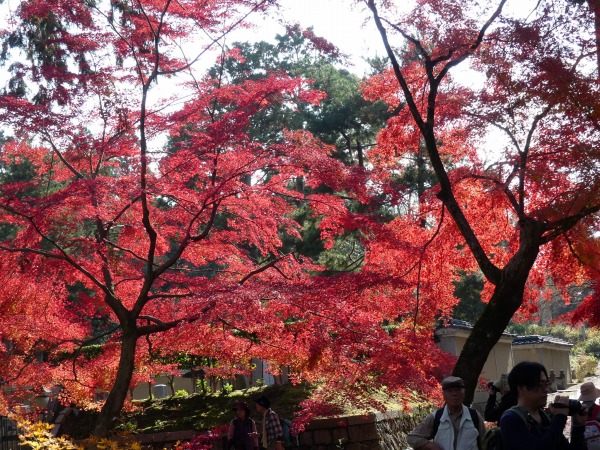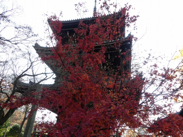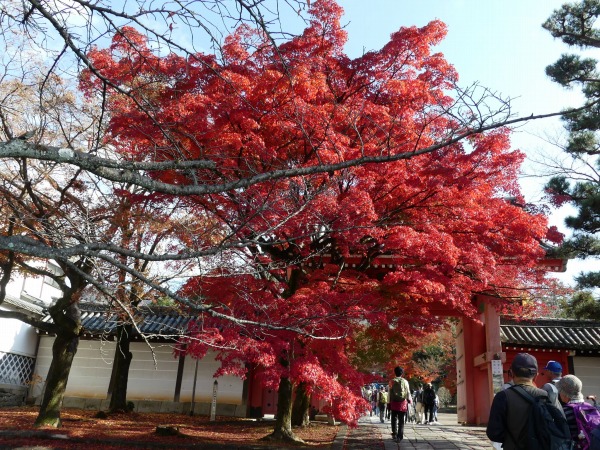 まず気になるのは、会津藩士墓所とあります。なぜここに墓所があるその理由は、江戸時代に城郭構造に改修されたこと、会津藩主の松平容保が京都守護職に命じられここを本陣としました。 約1,000名の藩士と共に薩摩軍と戦って戦死した藩士の菩提を弔ったのです。これらの墓所は、紫雲の庭と呼ばれ白と紅のコントラストが映える紅葉スポットの一つです。墓所を抜けると 金戒光明寺の三重の塔が見えてきます。この塔の前からの眺望がとても素敵です。京都タワー、平安神宮の赤鳥居なども見る事が出来ます。階段を降りると本堂につきます。 光明寺の紅葉スポットは、境内の中に点在してありますので各自自由に散策します。