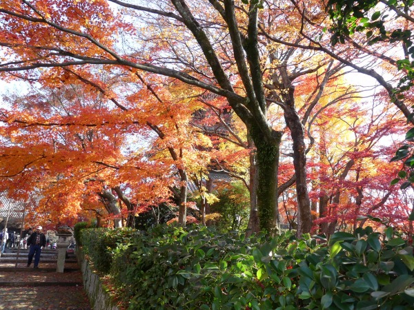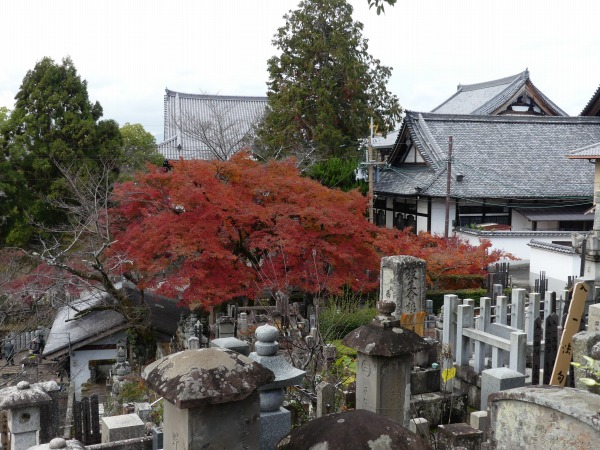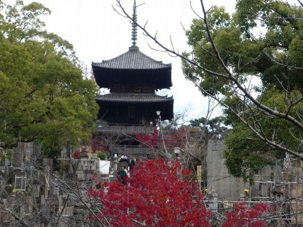 山門を入るとまず目に留まるのが三重の塔です。本堂にお参りした後、本堂右側の小径から本堂裏を一周します。ここが真如堂の紅葉のスポットです。 是非紅葉のトンネルを味わって下さい。本堂前に戻ってきます。本堂一周の小径から右に曲がります。少し歩くとお墓が見えてきます。もうここは、金戒光明寺の境内になります。
