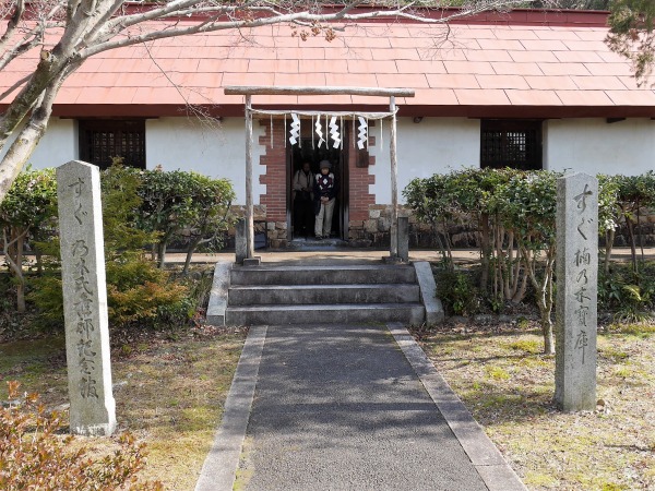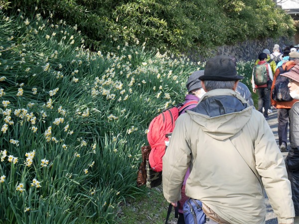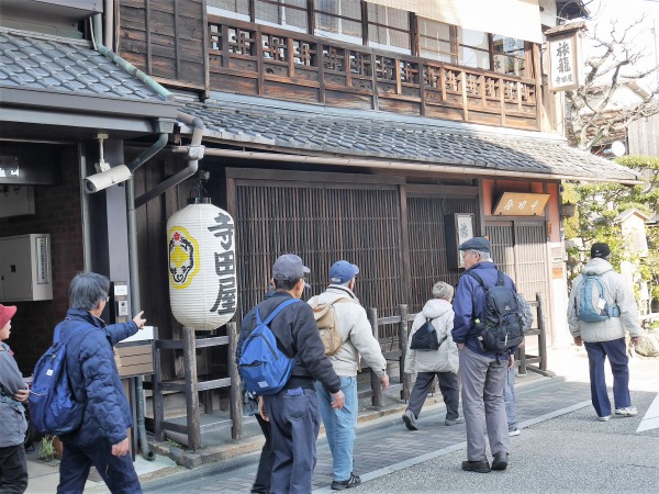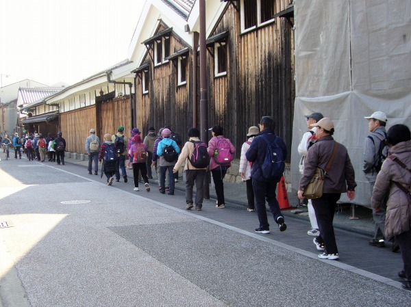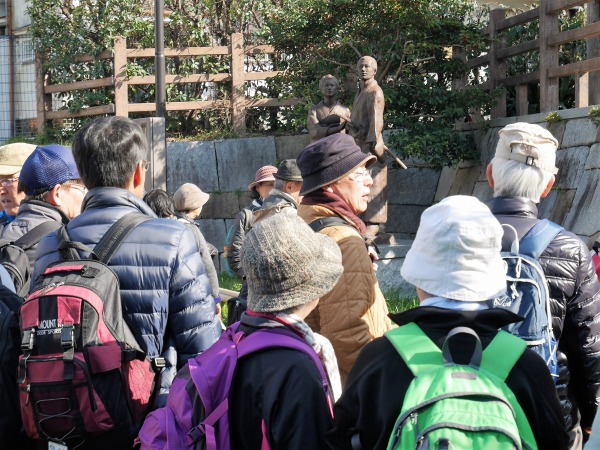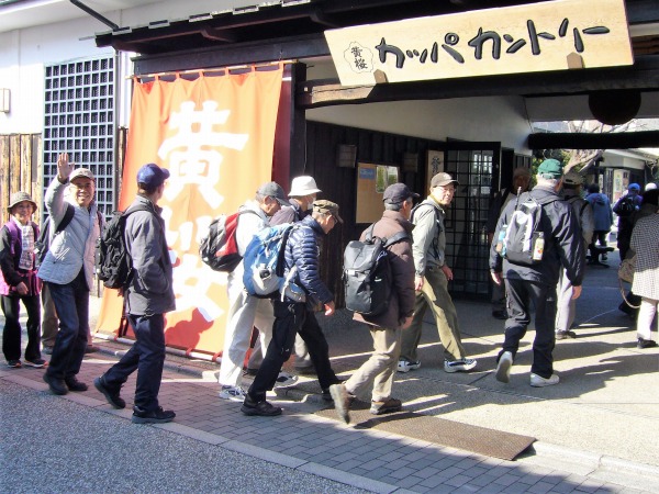 「伏見港みなと広場」から「伏見港公園」を通り、壕川に沿って歩いていくと、水仙・蝋梅(ろうばい)が咲き誇り、梅も咲き始めていました。 「龍馬とおりょう、愛の旅路」像の横から上がり、橋を渡り、寺田屋(1866年(慶応2年)正月21日坂本龍馬も伏見奉行所の捕方に襲われたが、 難を逃れたそうです。鳥羽伏見の戦に罹災し消失、その後再建)の前を通り、「竜馬通り商店街」から「黄桜カッパカントリー」に到着です。