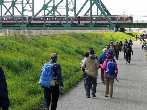 乃木神社から、急な下り坂に注意しながら下り、さらに県道188号線を南下、京阪観月橋駅付近で、宇治川の河川敷に出ました。 この辺りは2017年8月に「ツバメのねぐら」で歩いた場所で、当時の記憶が思い出されます。近鉄電車の高架下を超えさらに歩くと右側に「伏見港公園」が見えてきました。