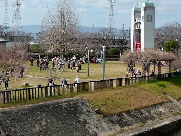 ここは昔「伏見の浜」と呼ばれて、伏見城が築かれた頃から第2次世界大戦まで、淀川舟運の基地でした。江戸時代には、三十石舟や高瀬舟などが往来して、港町として大いに栄えたそうです。しかし舟運は衰退し昭和30年代半ばで、港の機能は幕を閉じ、その後「伏見みなと公園」として整備されました。