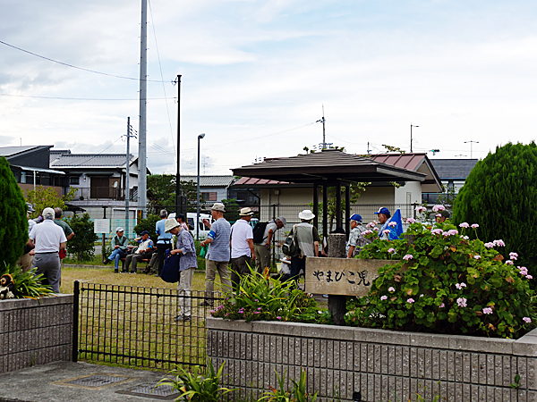 国宝に指定された石清水八幡宮があり、春の桜で名高い三川合流の八幡市駅周辺には、少しは川風もあるかと思いながら、京街道入口にあるやまびこ児童公園に集まりました。