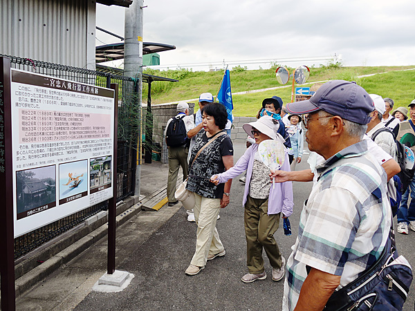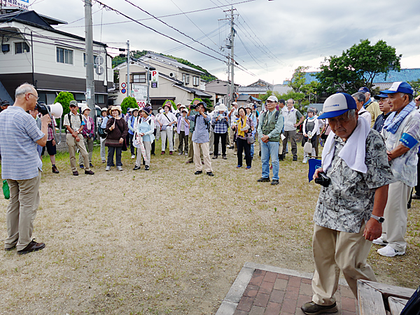 旧国道京都守口線と大谷川に挟まれた平地に、東高野街道から京街道につながる狭い道を気をつけながら一列に進む。京阪電車と川と街道との最も狭い場所を少し過ぎ、まもなく宇治川と合流する街道の分岐あたりに「二宮忠八飛行器製作所跡」の説明板がある。