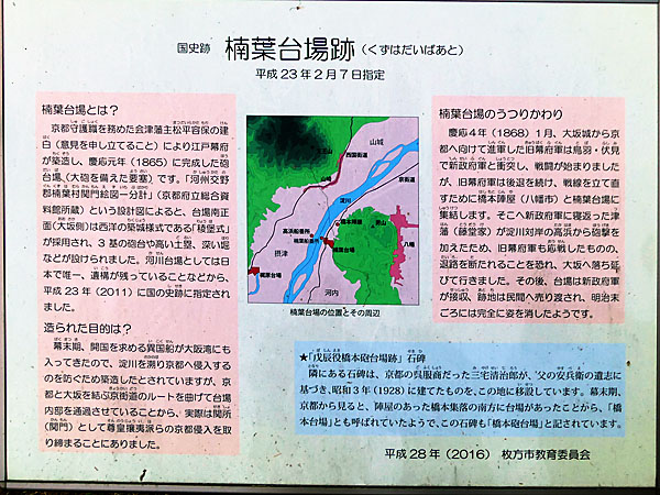 休憩の後の、すぐ横は京阪線を超えると桂川、宇治川、木津川の三川合流が終わり淀川となる場所。幕末期に勝海舟の設計による京都守護のため楠葉の砲台があった「国史跡楠葉台場跡公園」となっている。西洋式砲台でありながら、京都伏見への関所しての機能も持っていたところです。