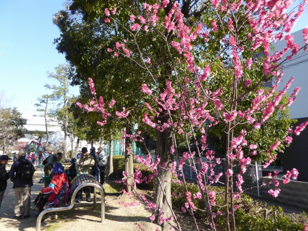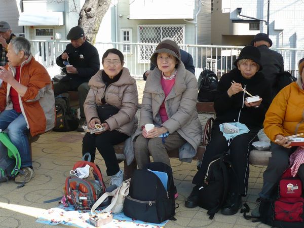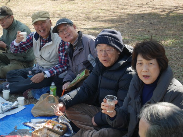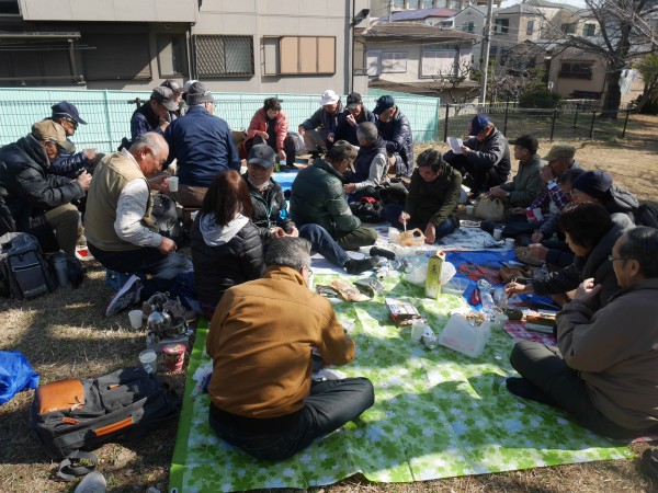 昼食場所である「石屋川公園」に12時過ぎに到着しました。公園内のトイレが小川を挟んで向こう側にあるので、2号線まで戻って川を渡るしか方法が無く不便でした。日差しが温かく1時間余りの昼食で、試飲が呼び水になったか、お酒を飲まれる方も多く見受けられました。