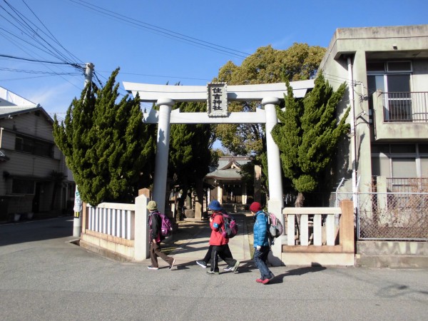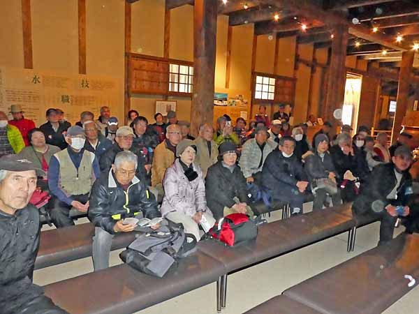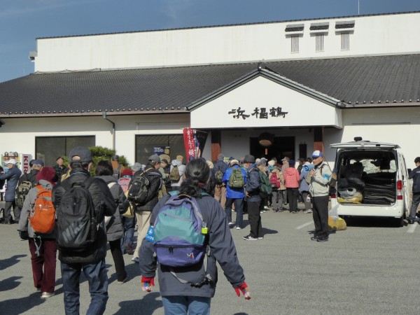 住吉川にはカモが気持ち良く泳いでいて、のんびりした風景です。公園には梅の花も咲きかけています。朝会では、初参加の方2名<寺村雄司さん(北)、松井 忍さん(仲)>のご紹介の後、50回参加の林 博司さん、渡部冨美子さん(30回)、古賀行憲さん(12回)の回数表彰がありました。その後、今年から世話役になられた江守さんのご紹介、今回のコース説明、次回の案内などがあり、10時15分に最初の目的地である「浜福鶴酒造」に向け出発しました。