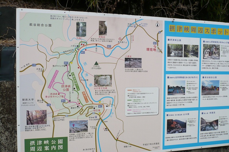 〈行程〉JR 高槻駅⇒上の口バス停⇒ 白滝 ⇒ 摂津峡公園桜広場(昼食) ⇒あくあぴあ芥川(休息/一次解散)⇒芥川緑地公 園⇒芥川一里塚⇒JR 高槻駅(解散) 〈距離〉 約 8km