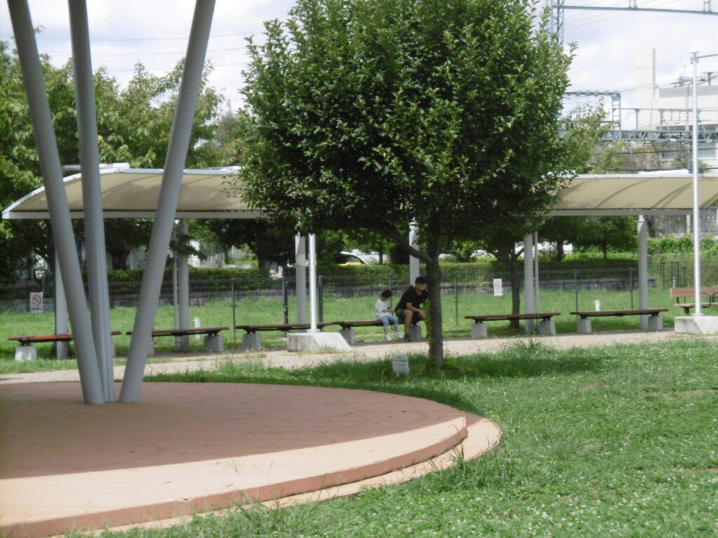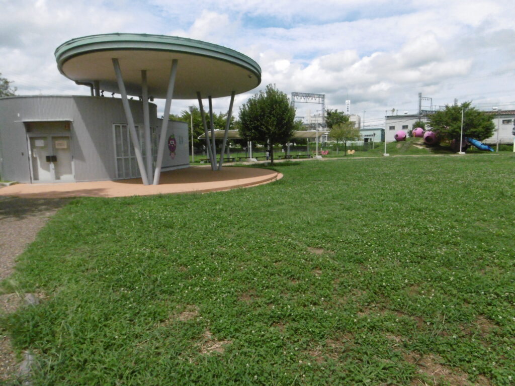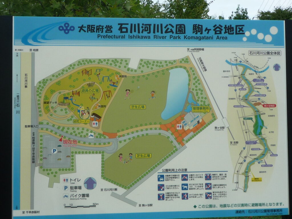 その橋を渡って直ぐに右側の階段を下りて、川沿いに歩くと近鉄の鉄橋が見えてきます。その鉄橋の下を通り臥龍橋から鉄橋までと同じくらい歩くと、パターゴルフ場及び観覧席があります。またその近くに仮設トイレもあります。その土手を上がると、石川河川公園があり広い駐車場と子供の遊び場(遊具)もありその奥に公園管理事務所あります。エアコンの効いた快適な場所でしたが中での飲食は断られました。当日は公園の芝生の上で食事を取っていただく予定です。案内所を出て直ぐに最終解散場所の駒ケ谷駅があります。駅を横目に竹内街道を進むと、魚亀食料品店の看板があり、そこを左折して道なりに進むと、右側に目的地の「河内ワイン館」があります。