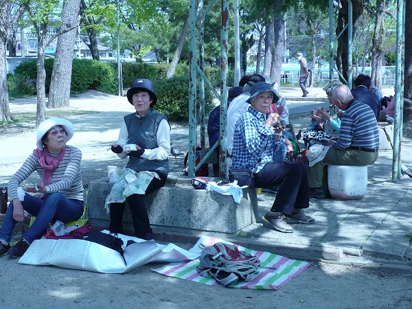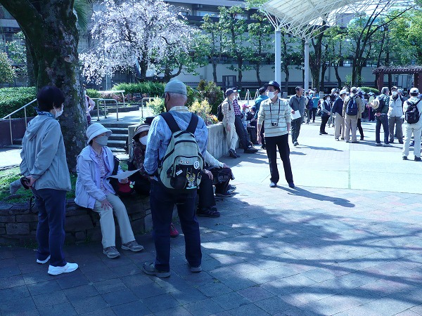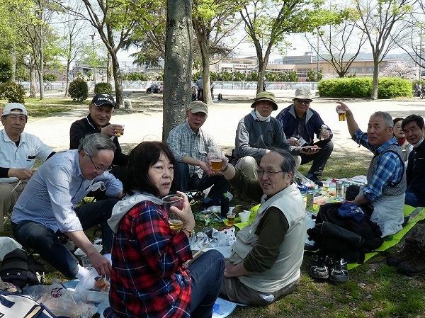 枚方市駅中央改札口を出て、2階9番出口よりTSUTAYAビルの横を通り、スロープを降りた所が、ニッペパーク岡東中央公園である。侍ジャパンの優勝を祝うように咲いていた満開の桜も、徐々にちりはじめ、3割くらいに感じられた。それでも十分に美しい。9時20分くらいから参加者が集まりはじめ75名の参加者でした。