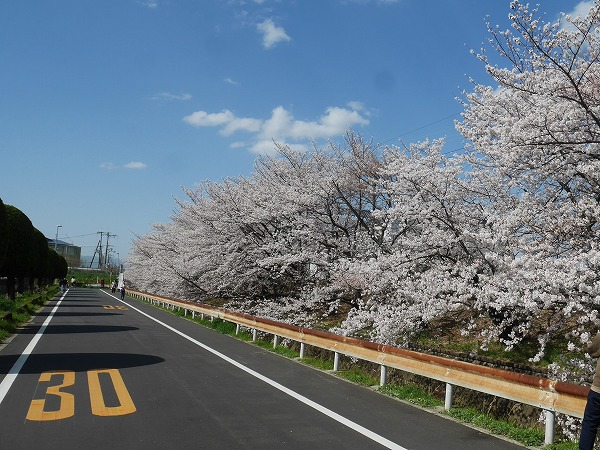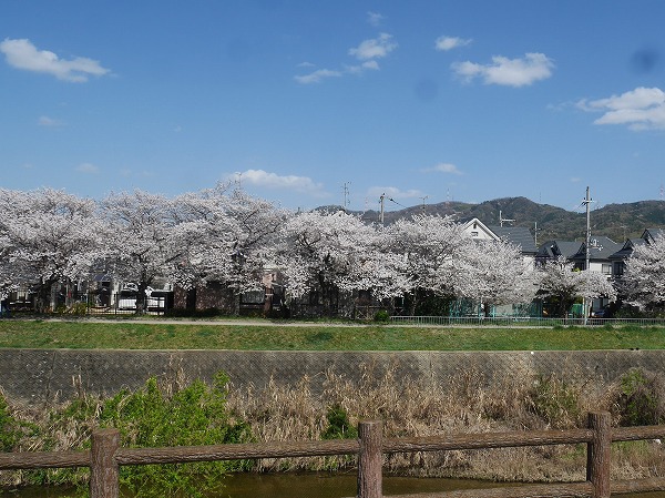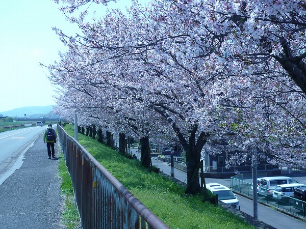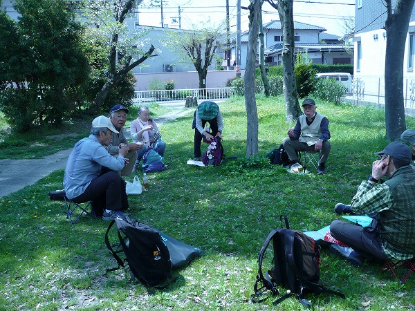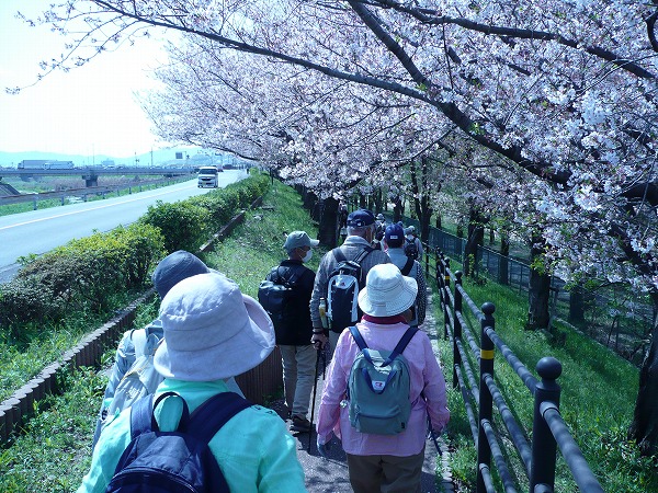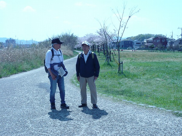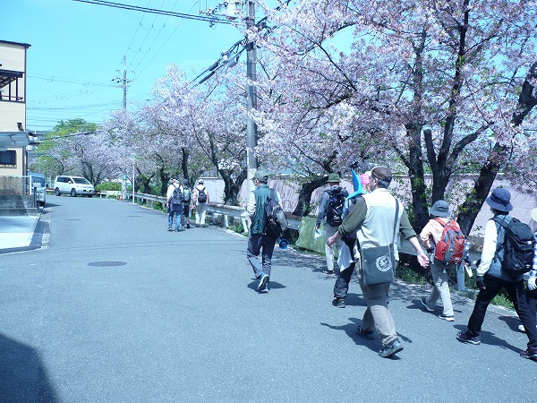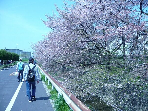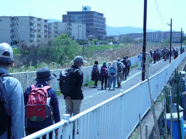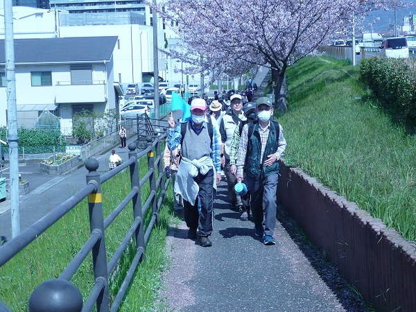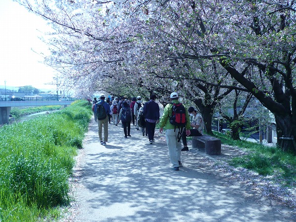 続いて徳田リーダーから本日のコース説明と注意点として、「昼食会場まで100分くらい歩きますがトイレが無い。我慢できないときは少し寄り道をして、サプリ村野に行ける。小野田サブリーダーが案内するので申し出てください。」と説明があった。枚方警察署の裏側から天の川の土手に出た。満開を過ぎてかなり散り始めている。もう1週間早ければ!と思うが自然相手にはどうしようもない。最後の所に1週間前の桜の写真を掲載しています。一路三角公園に向けて歩きました。