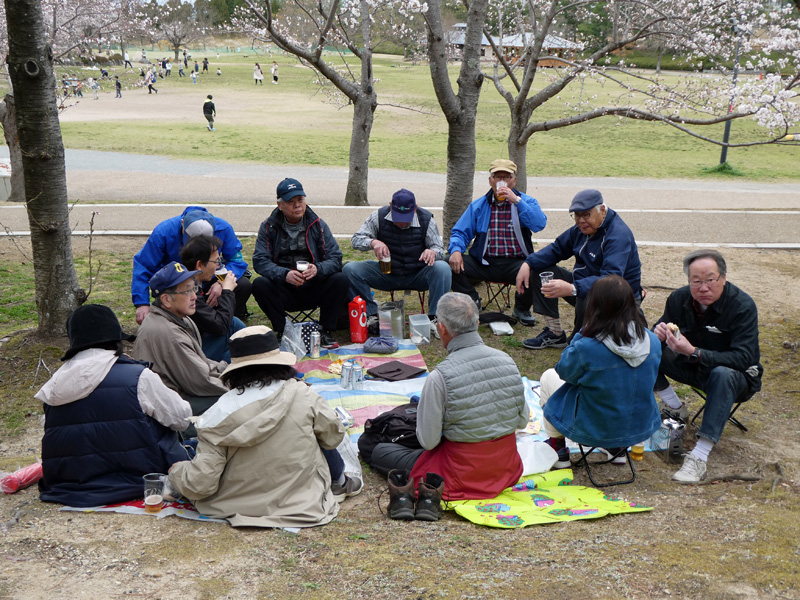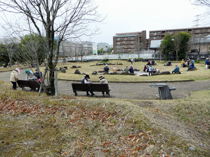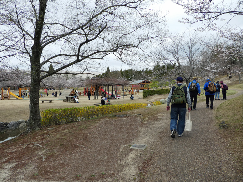 「けいはんな記念公園」は通称ですが、正式名称は「京都府立関西文化学術研究都市記念公園」と言うそうです。この公園の全体を紹介させて頂きますと、それにしても大きな公園で京都精華町に、1995年4月に開園され面積は24.1ヘクタールあるそうです。公園は無料区域と有料区域にわかれていて、無料区域は「谷あい」と「広場」から出来ていて、「谷あい」はせせらぎや竹の通り抜け、梅林等があり里山の風情があり日本の原風景として心が和むところです、今回行くのは桜が多く咲いているところで自由に遊べる大きな芝生広場と、子供向けの遊具もあります。そして有料区域は「水景園」回遊式日本庭園と「芽ぶきの森」で永谷池を囲む里山林、森の散策を楽しめ、春のツツジや夏の木漏れ日、秋の紅葉、冬の水鳥など、自然を満喫できますが、今回の入園は時間の関係で行けませんので、我々は桜の広場で昼食休憩を持って一次解散とすることとしました。また当初計画に会った国立国会図書館への見学も建物の方向だけを説明するのみに留めました。一次解散後はバスでJR祝園駅まで帰る人と歩いて行く人に分かれましたが、JR祝園駅からの電車が1時間に1本しかないので、少し急ぐ人はバスを利用することになりました。