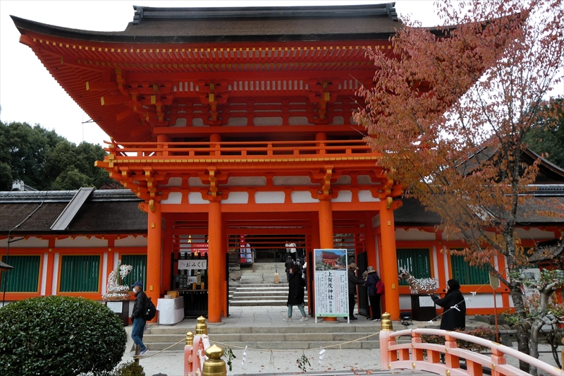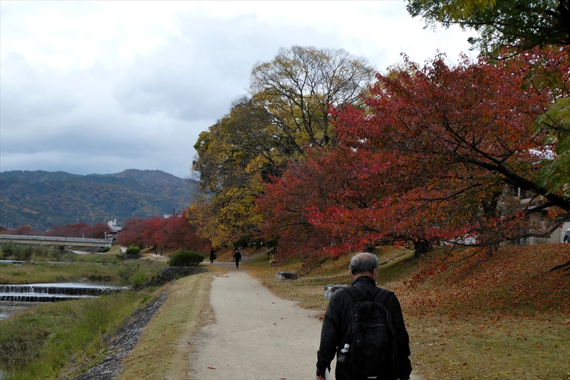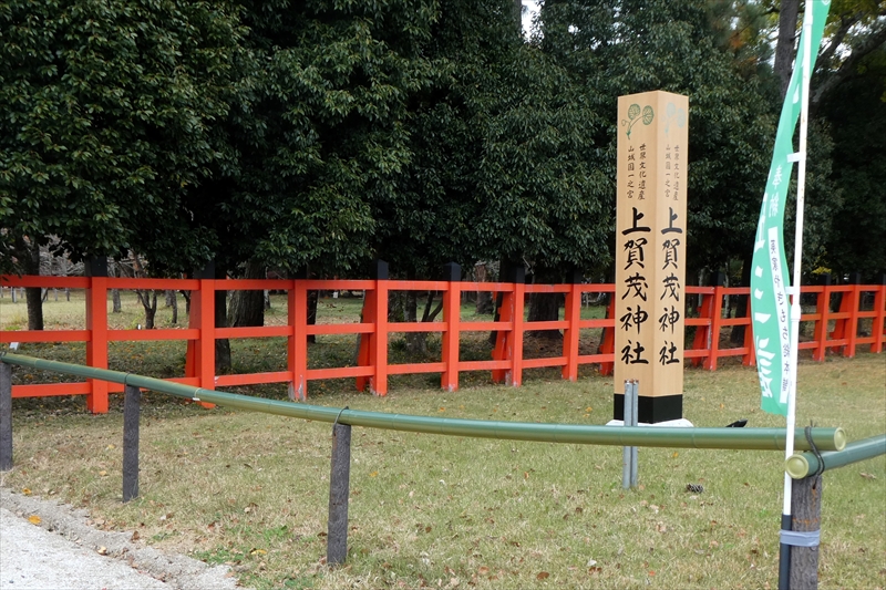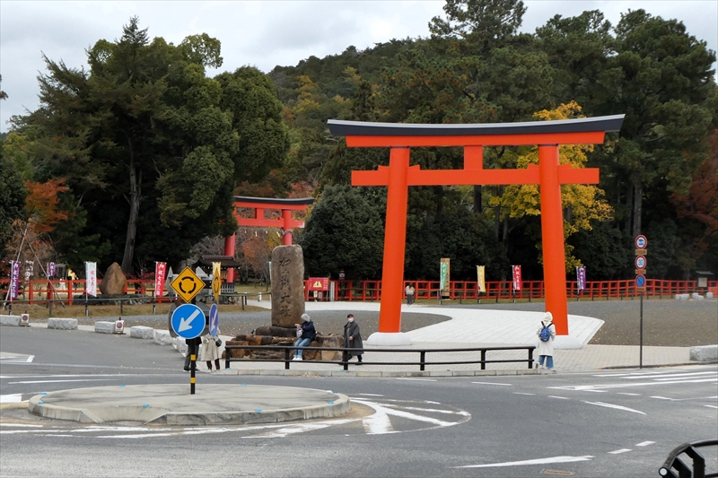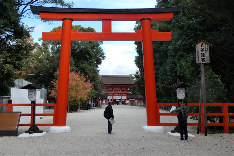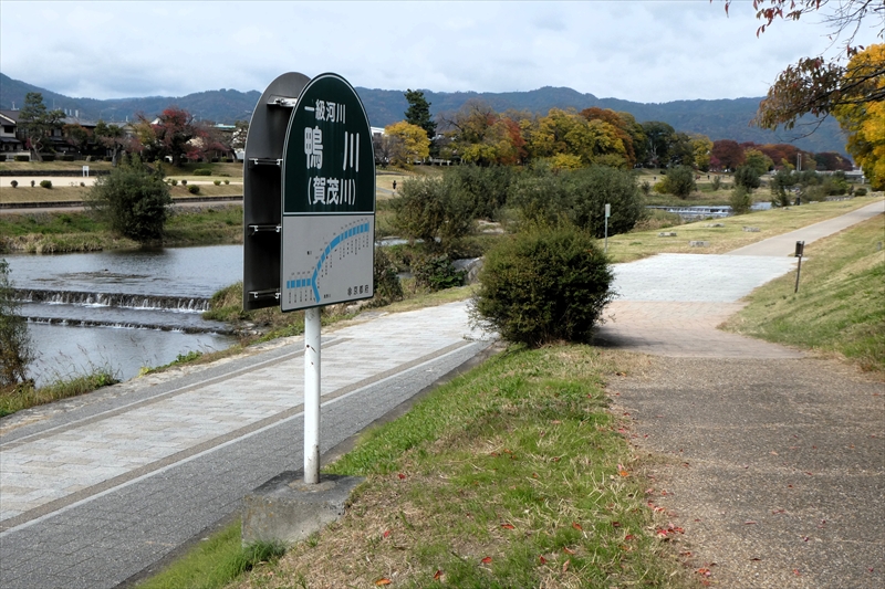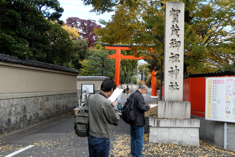 下鴨神社を出て、賀茂川に出ます。「出雲路橋」から、河川敷を「上賀茂神社」に向かって進みます。約1キロ弱進み、一度河川敷を上がり、植物園横の「半木の道(なからぎのみち)」を歩きます。風よけにもなります。北山大橋から再び、河川敷を歩きます。ここまででも結構距離がある(出町柳から約2キロ)ので、お疲れの方は、ここから「京都地下鉄 北山駅」へ行き、帰ることも可能です。この辺でしか昼食する場所がありません。河川敷のため、『火気厳禁』です。さらに進み、「御園橋」まで来て、河川敷をあがると、「上賀茂神社」が見えてきます。七五三の時期なのでお親子連れが多くみられます。