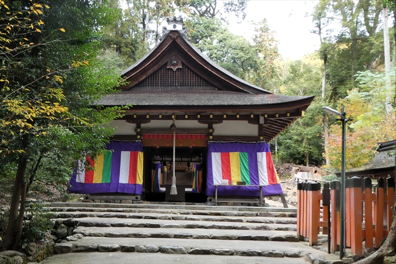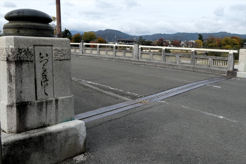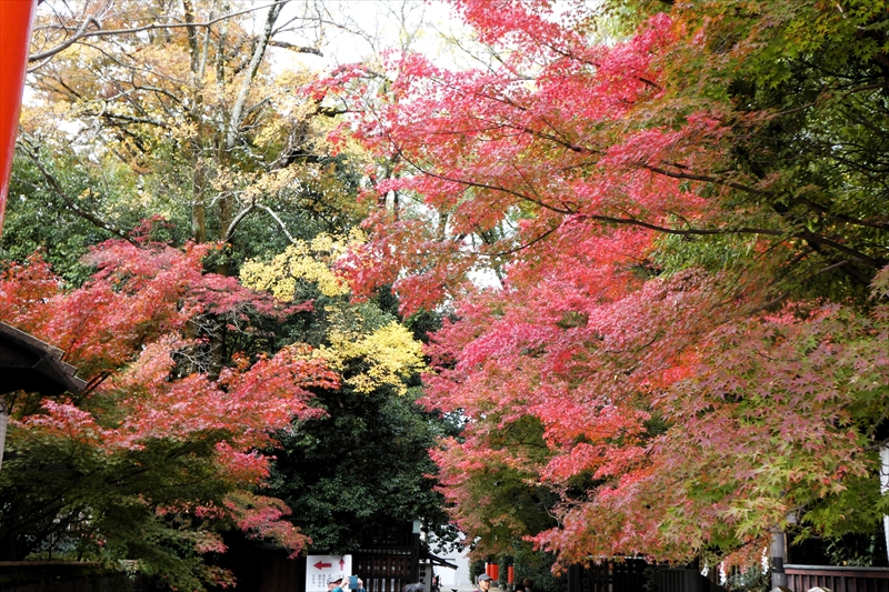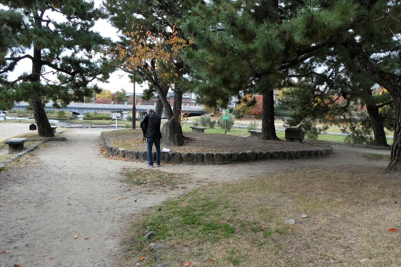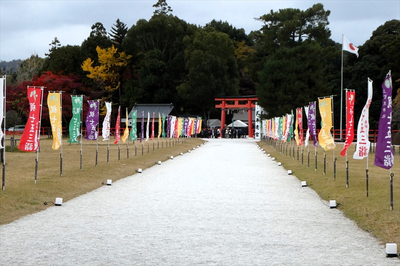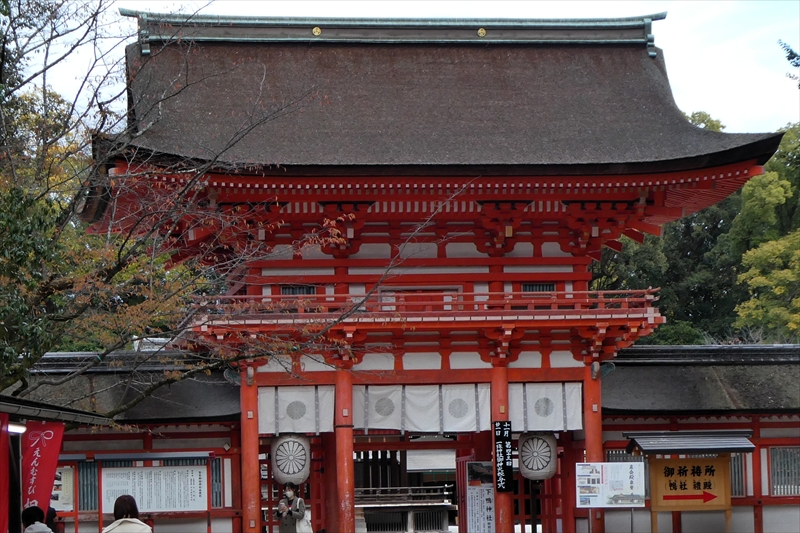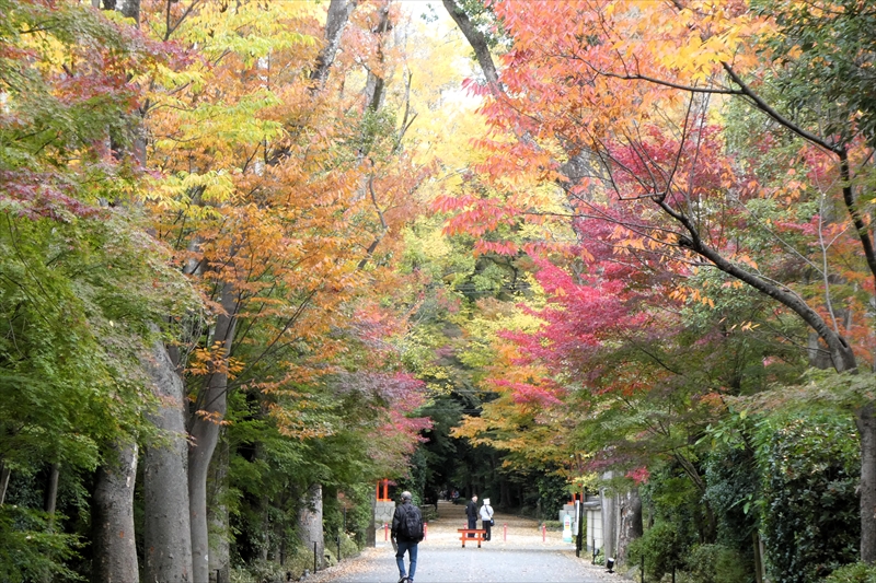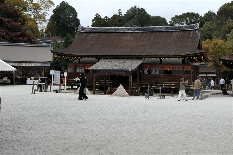 下鴨神社を出て、賀茂川に出ます。「出雲路橋」から、河川敷を「上賀茂神社」に向かって進みます。約1キロ弱進み、一度河川敷を上がり、植物園横の「半木の道(なからぎのみち)」を歩きます。風よけにもなります。北山大橋から再び、河川敷を歩きます。ここまででも結構距離がある(出町柳から約2キロ)ので、お疲れの方は、ここから「京都地下鉄 北山駅」へ行き、帰ることも可能です。この辺でしか昼食する場所がありません。河川敷のため、『火気厳禁』です。さらに進み、「御園橋」まで来て、河川敷をあがると、「上賀茂神社」が見えてきます。七五三の時期なのでお親子連れが多くみられます。
