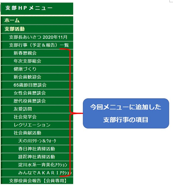2020.11.28 HP役員会, HP役員会関連資料 過去すべての支部行事を閲覧しやすくしました! ご覧ください[11/28] 過去の支部行事すべてを「支部HPメニュー」から直接見れるようにしました。 クリックして支部行事のページ一覧をご覧ください。 ページ一覧は新しい順にページが並んでいます。 記事がよければ「いいね!マーク」のクリックをお願いします 投稿者: HP-中村 HP役員会, HP役員会関連資料