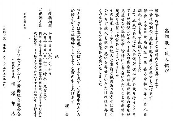 2021.07.20 支部だより 高畑 敬一様のメモリアル映像ご視聴のお知らせ(視聴期間:8月15日まで) [7/20] ご視聴方法のご案内 ご視聴いただく場合は下記のいずれかへのアクセスをお願い申し上げます。 1)URLからのご視聴の方 https://bit.ly/3zDxDhj 2)QRコードからご視聴の方 ◆ ご視聴期間 令和3年7月15日12時~令和3年8月15日23時59分 2011年1月 枚方南支部新春懇親会に3班会員としてご出席されました 投稿者: HP-中村 支部だより コメント: 1