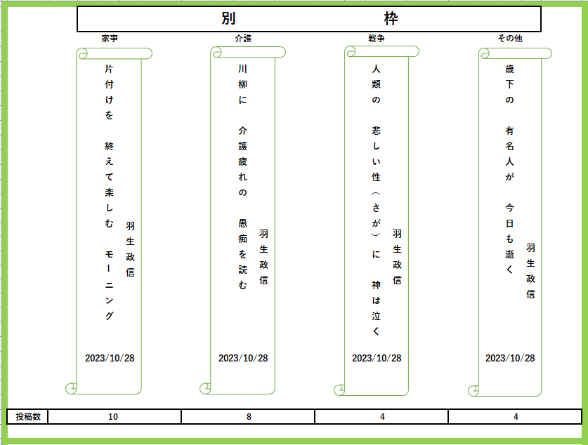2023.11.10 お役立ち情報, 内容紹介 どさんこ文芸館 川柳の部 2023年度F-2 クリックしますと拡大します。 20231028情報交換会作品 内容紹介のページに戻ります 投稿者: harada お役立ち情報, 内容紹介 コメント: 0