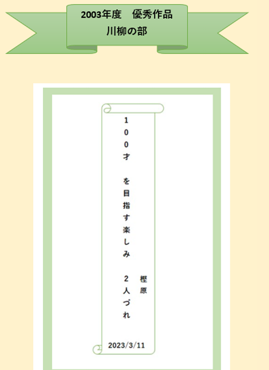 2025.03.30 お役立ち情報, どさんこ文芸館 どさんこ文芸館 2023年度 年間投稿作品の優秀賞川柳の部 ・川柳の部 ・投稿者:樫原 隆司さんの作品です。 内容紹介のページに戻ります。 投稿者: obata お役立ち情報, どさんこ文芸館 コメント: 0