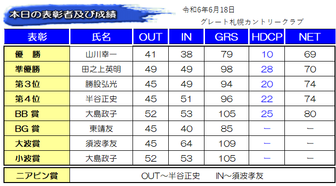 コメント :天気はままで、少人数ながら好スコアを出す方もあり、