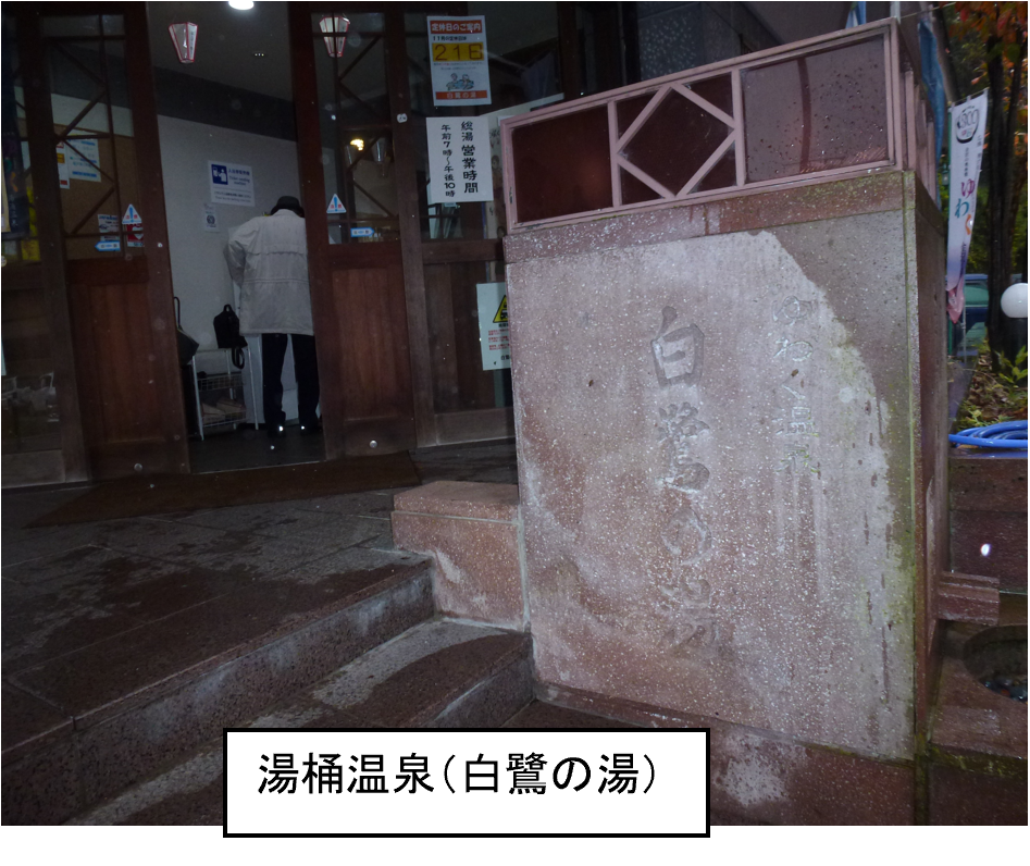 3, 白鷺の湯入口で記念写真を撮り湯船に浸かる。外は大荒れだが温泉はGood。