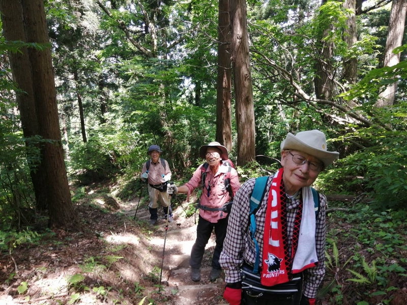 6. 所感   今日は、下界は暑く30℃越え、1000m級でもよい気温でした。幸いこの山は、前半谷沿いでかつ神社の参道であるため樹齢がかなりある大木が両側に聳えていて比較的涼しかったです。谷沿いには、水ぶき、茗荷がありました。3年前文殊山でお会いした、芦原から来られた博学のおじさんに会い、山頂にて1時間程度話込んでしまいました。話題は、Chat GPT, AI、コンピュータ言語、自動翻訳、ダークマタ、核融合、YAMAP、この近辺の里山の登山道の状況、腸内細菌、体に良い食べ物の具体的判別法等々多岐に渡りました。今回も、博学に圧倒されました。 帰り際15分程度、お土産に水ぶきを採り大満足にて帰りました。(畑下 正和)