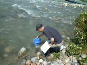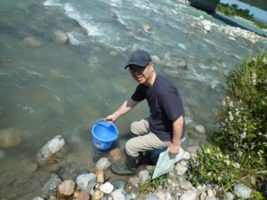 昨日迄の大雨で、川の流れが非常に早く、足元に注意し水を採取しました
