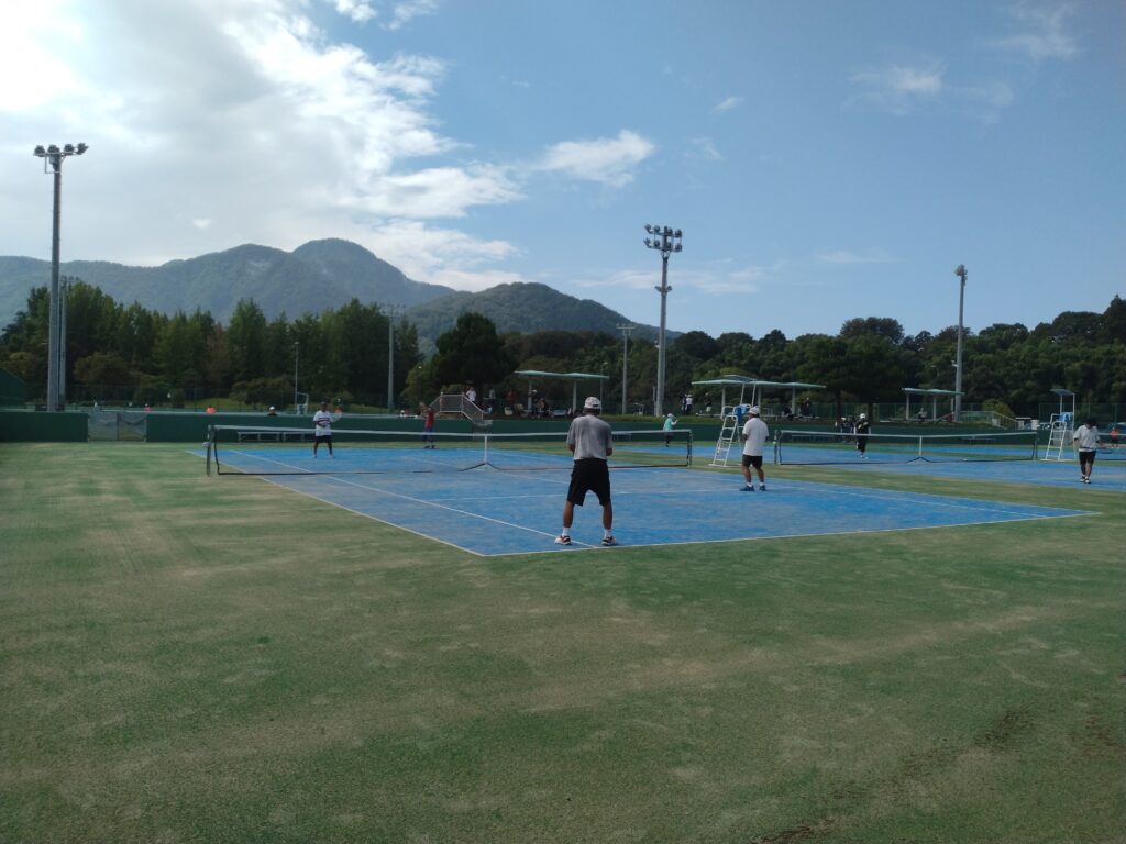 - 紹介 本日は、例会として、初めて武生東運動公園庭球場を使いました。この春から改修が行われ、人工芝の新しいコートが8面新設されました。日頃使用している中央コート(12面)にて大会が開催されても、バックアップとして東運動公園のコートにて例会を実施できるようにしました。これにより、ほぼ平日は、いつでもテニスが出来る環境が整いました。この9月を例にすると中央コートのみ使用だと月間3日休みが1日のみの休みに改善しています。