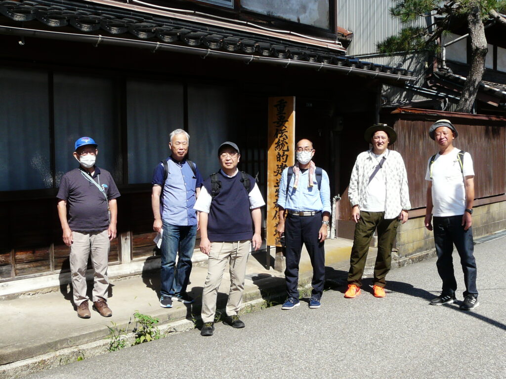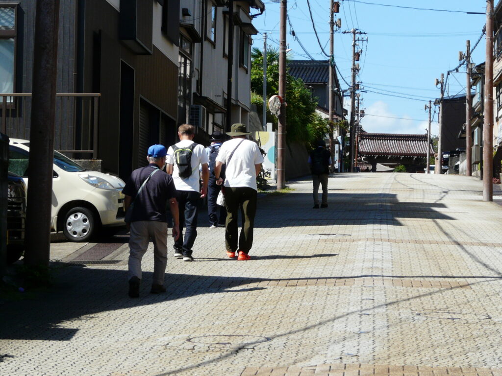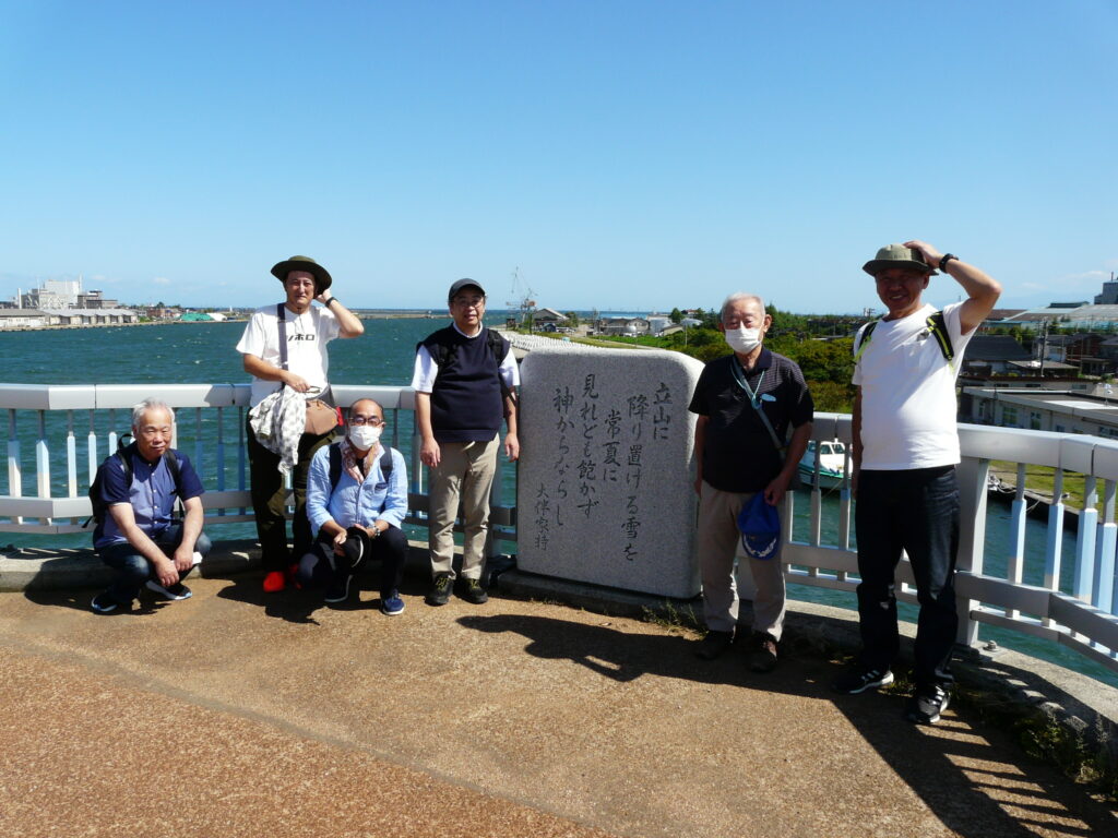 ここから歩こう会スタートです、吉久伝統的建造物群保存地区(江戸時代後期から近代に建てられた繊細な格子戸(さまのこ)が特徴の切妻造平入の町家)を抜け、2009年に完成した伏木万葉大橋を秋のさわやかな海風に抵抗しながら、一歩一歩上っていきました。