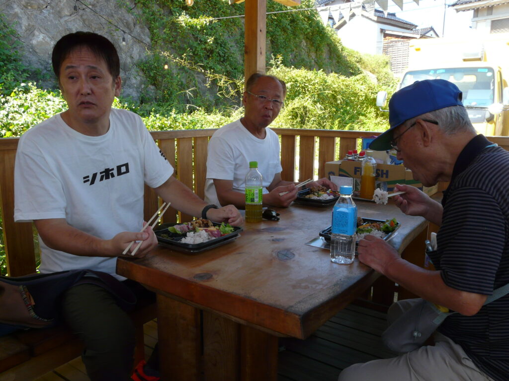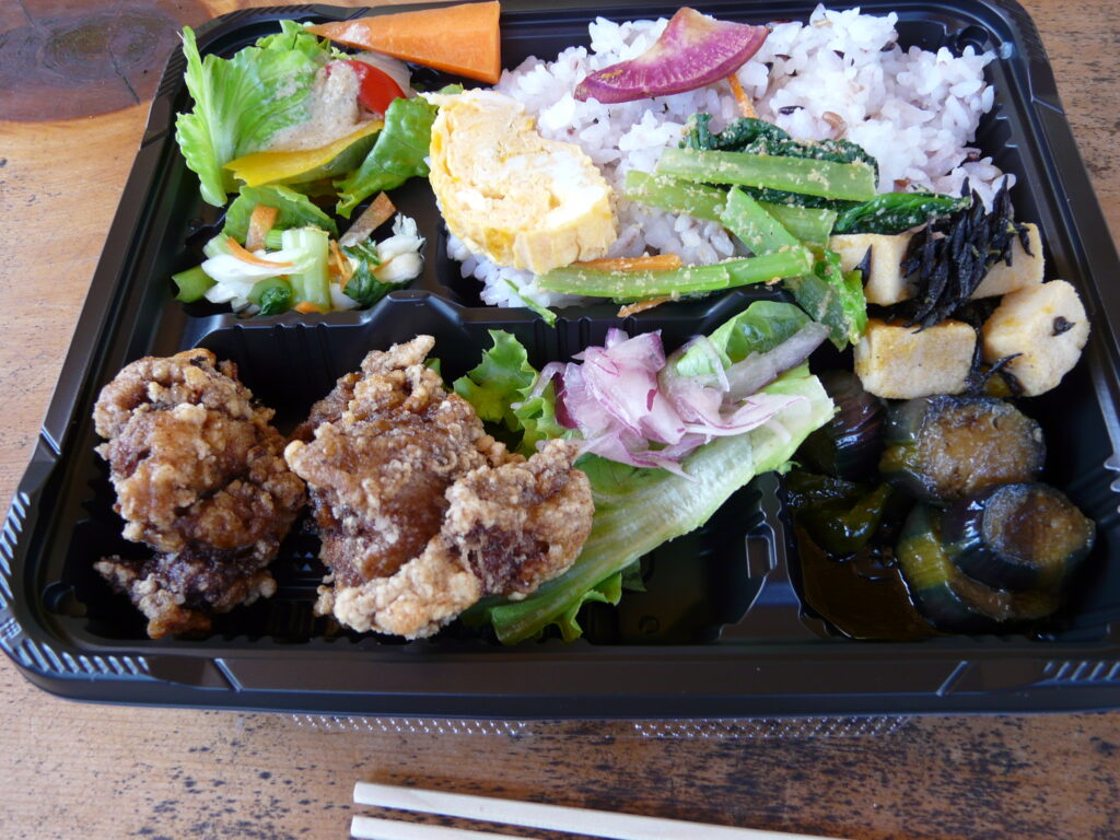 さあ、昼食です。昼食は「おべんとうカフェにじのこや」の唐揚げ弁当(野菜たっぷり)お店の外のベンチに座りおいしくいただきました。