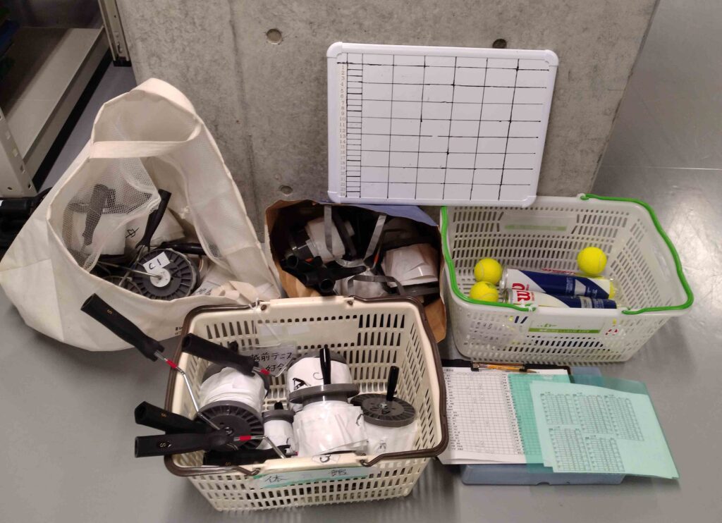 - また、毎日使用にあたっては、ポール・ネット設置、さらに白線テープを貼ってコートを設定(写真3)、終了後は、器具撤収、貼ったテープを剥がして元に戻す必要があります。この作業が必要なため巻取り機を自作して手間軽減を図っています(写真4)