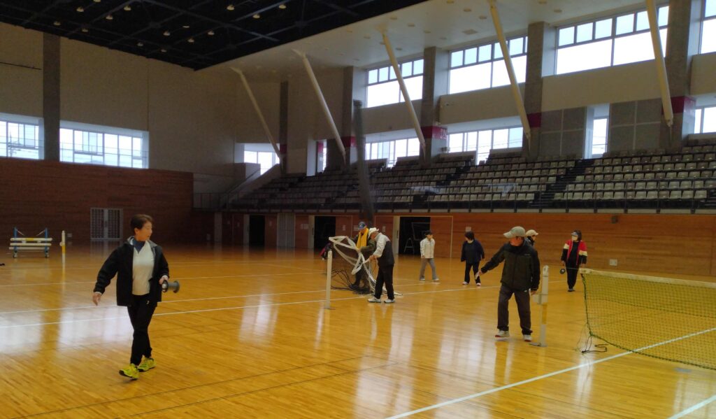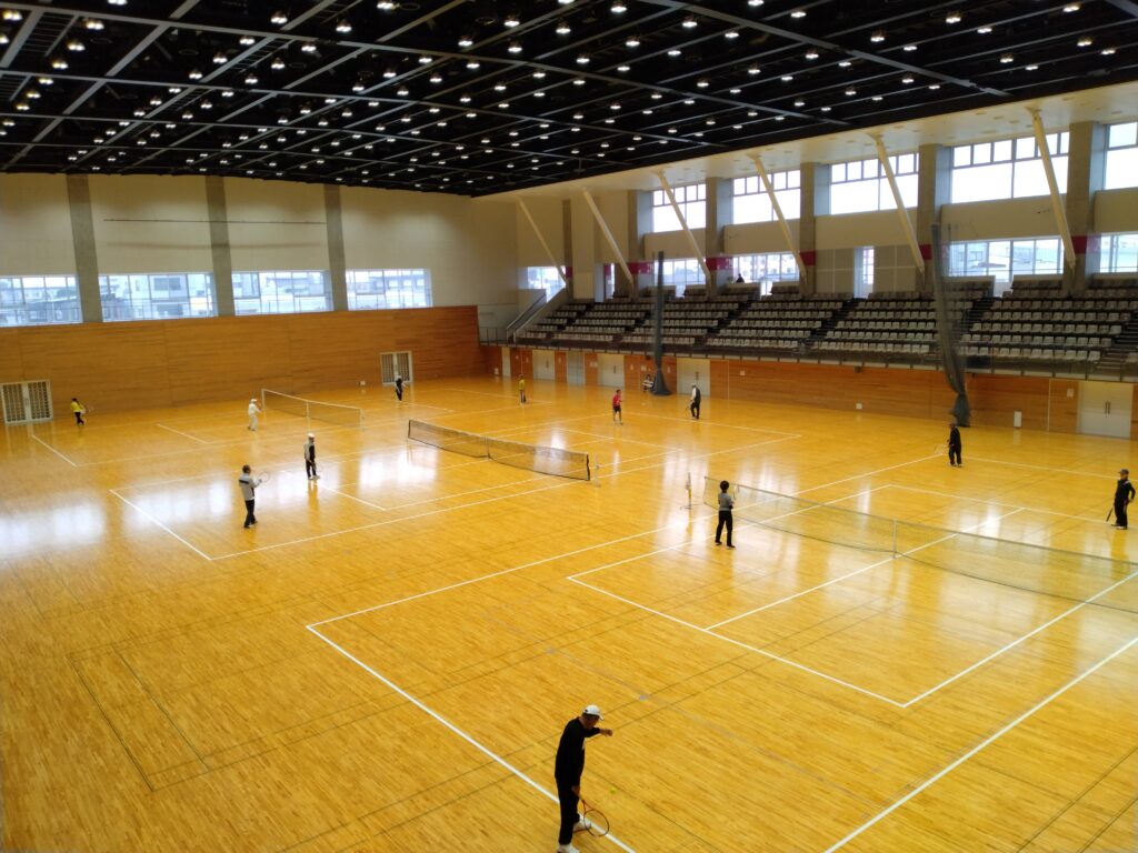 - 紹介 例会(月~金曜平日午前中)は冬場、野外コート(12月~2月まで閉鎖)は降雪のため使用できなくなり、屋内でテニスが出来る体育館にて行います。体育館は、6年前旧体育館に替わり新築されました。明るく(LED照明)なり、ランニングコース、ジム、サブ体育館等があり、イベント開催もあり、利用者も旧体育館に比べ格段に増え、使い勝手が良くなりました。